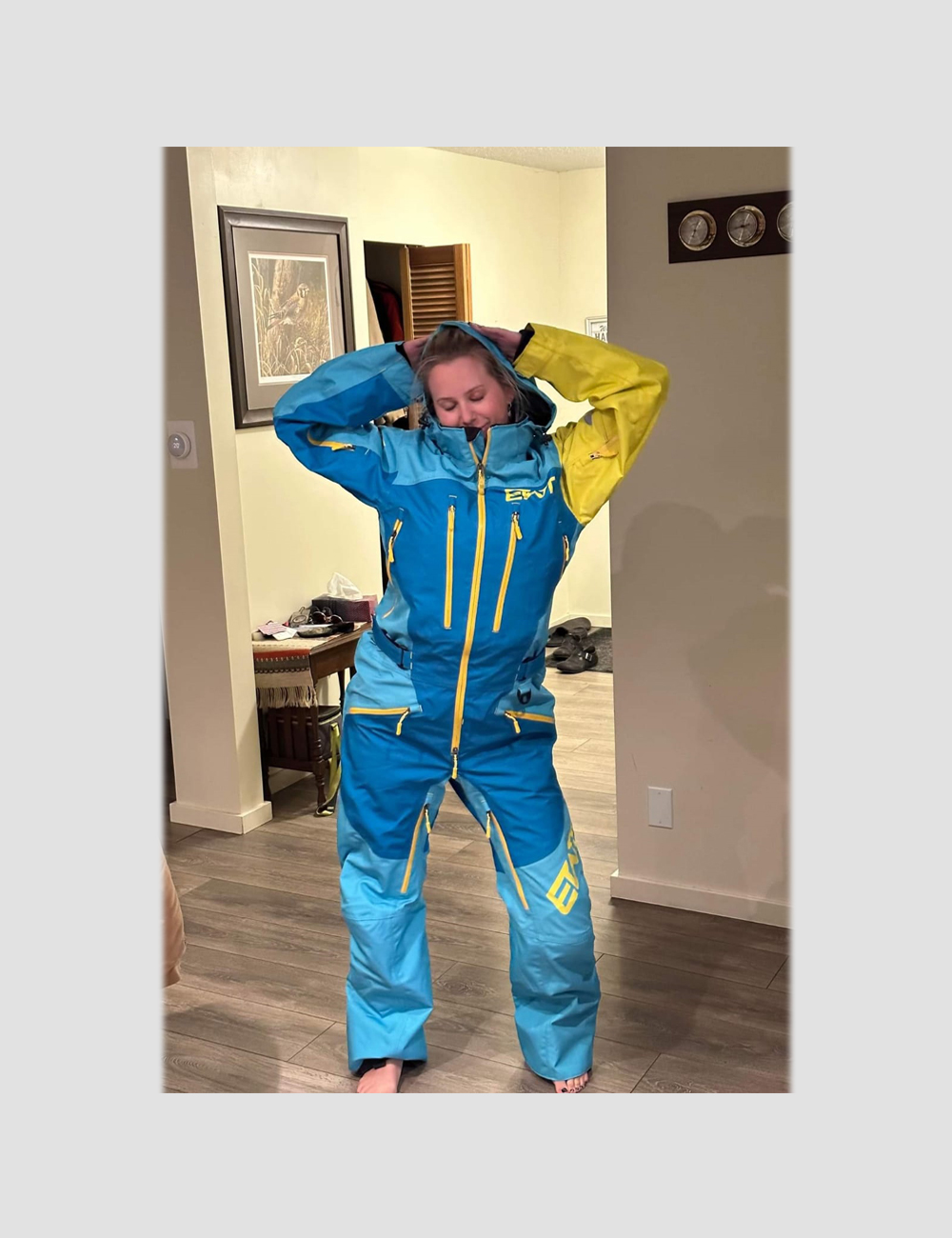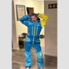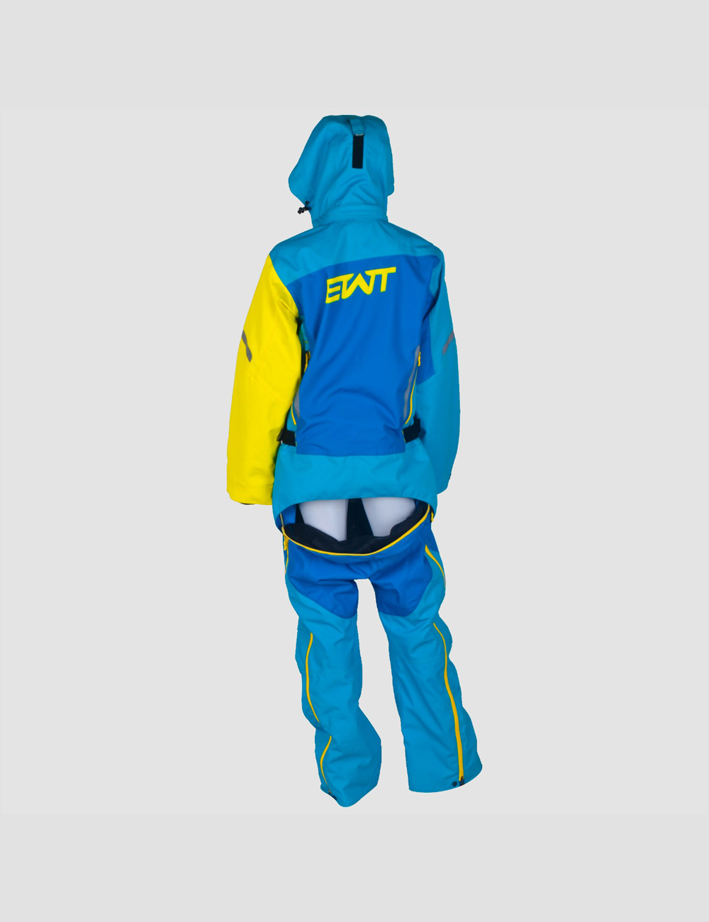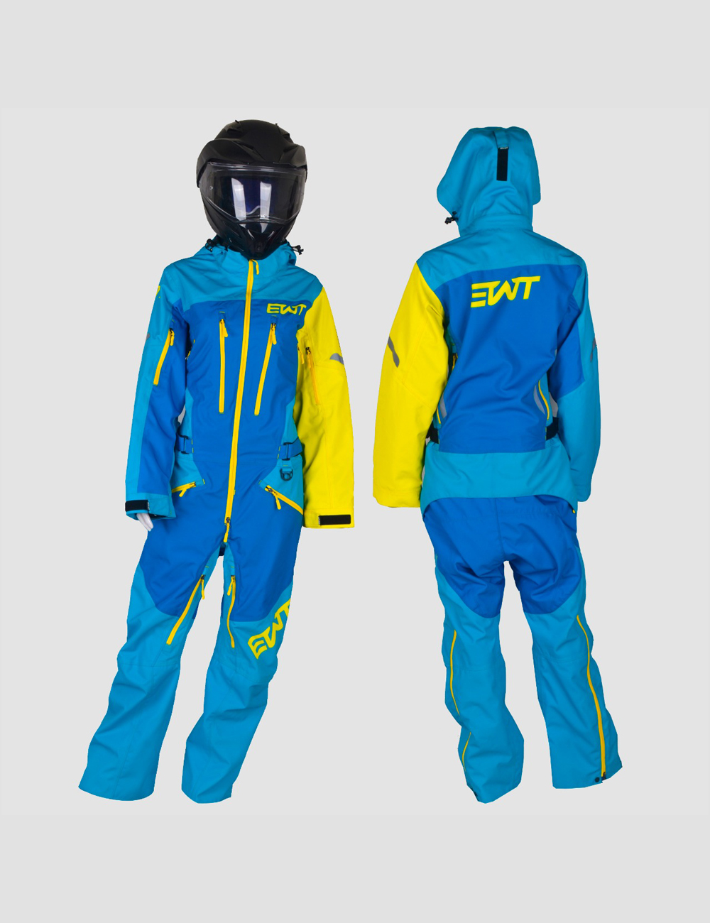 This Ladies Anna Two Mono Suit is made from durable, three-layer, 30k 30k fabric. It has a removable hood with YKK water resistant aqua guard zippers. It has air vents with Snow Frog mesh at shoulder, legs, and under arm. Cuffs are also snow proof. Pockets are located on chest, left arm, and two at the pant. This suit has snow gators at the ankle with Velcro and snaps. There is also a side adjustment with belt. All seams are sealed with a heavy duty tape. Lining is in black mesh. Colors are fully customizable and Removable Suspenders.