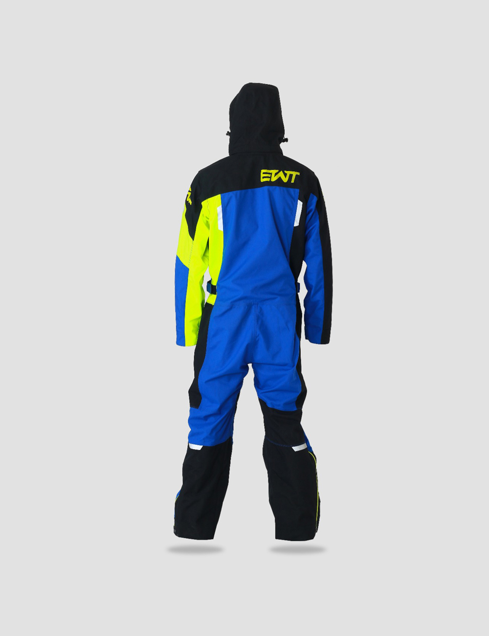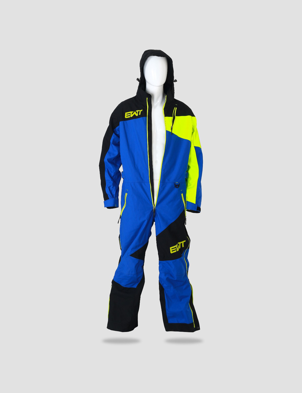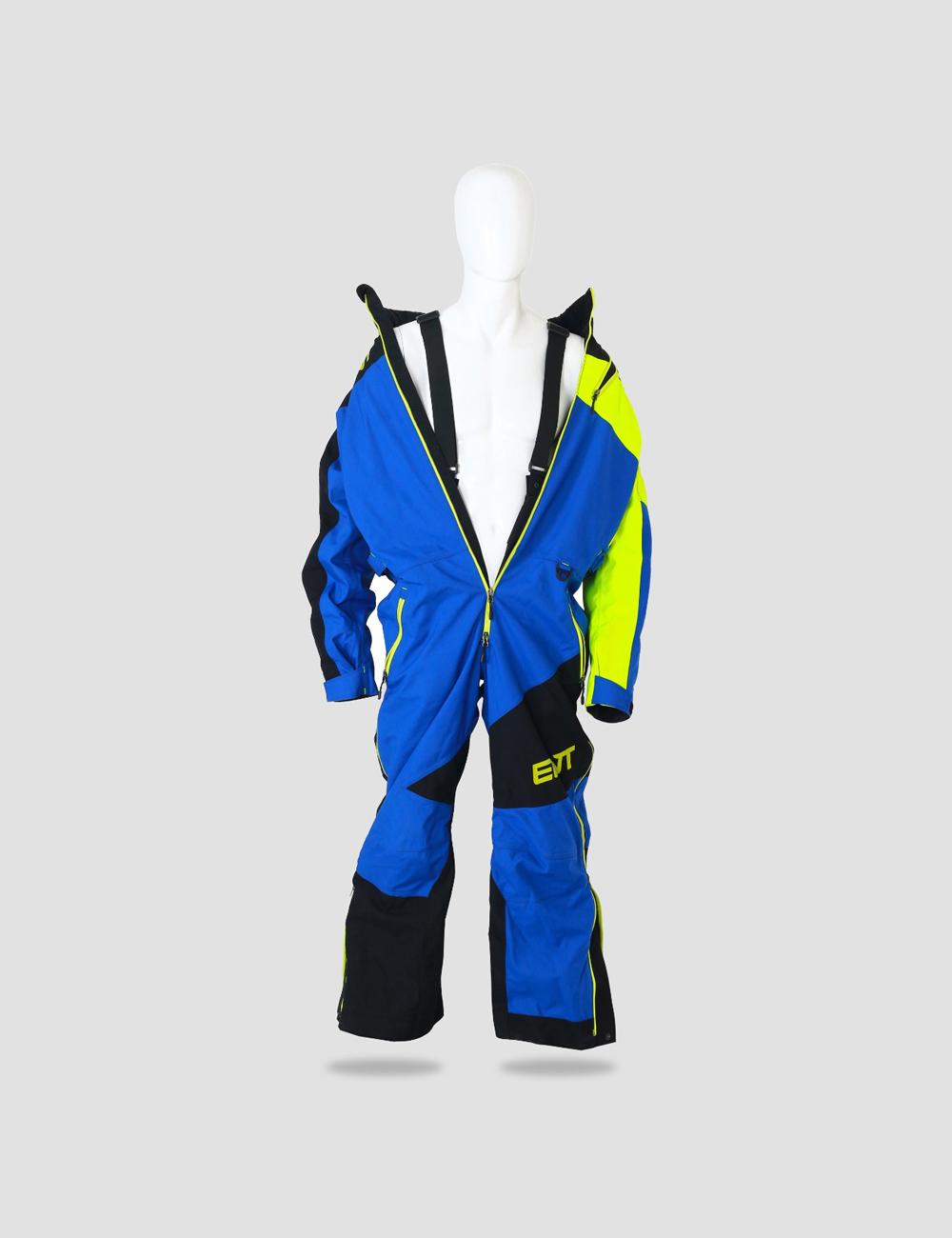 This Resolve Suit is made from durable, three layer, 30k 30k fabric. It has a removable hood with YKK water resistant aqua guard zippers. It has air vents with Snow Frog mesh at shoulder, legs, and under arm. Cuffs are also snow proof. Pockets are located on chest, left arm, and two at the pant. This suit has snow gators at the ankle with Velcro and snaps. There is also a side adjustment with belt. All seams are sealed with a heavy duty tape. Lining is in black mesh. Colors are fully customizable and Removable Suspenders.
