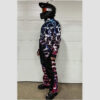This Snowbike Wide Open Throttle-2 Suit is made from durable, three layer, 30k 30k fabric. It has a removable hood with YKK water resistant aqua guard zippers. It has air vents with Snow Frog mesh at shoulder, legs, and under arm. Cuffs are also snow proof. Pockets are located on chest, left arm, and two at the pant. This suit has snow gators at the ankle with Velcro and snaps. There is also a side adjustment with belt. All seams are sealed with a heavy duty tape. Lining is in black mesh. Colors are fully customizable and Removable Suspenders.
